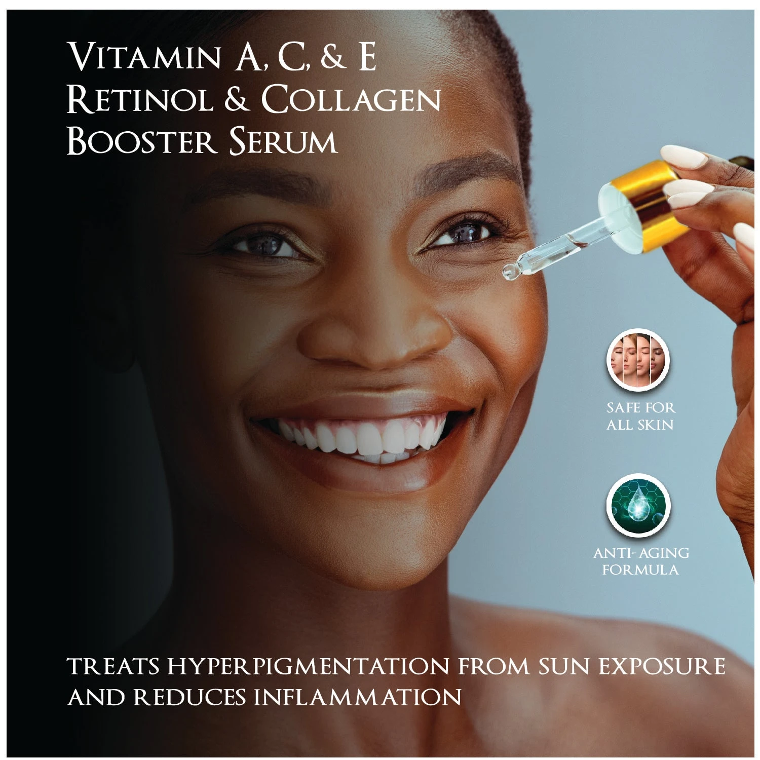 Your appearance tells how you feel about yourself, that’s why it’s important to maintain it. Hyperpigmentation is responsible for skin conditions such as pimples and post-inflammatory dark patches. As a result of exposure to the sun, age spots are formed (also known as sunspots). Aged skin has a reduced capacity to retain moisture, secretes oil more slowly, and heals itself at a slower rate. Consequently, wrinkles appear. Wrinkles and fine lines appear on the face as a result of collagen loss and skin dryness. Gold is rich in antioxidants and anti-inflammatory compounds which protect the skin from UV damage. The Multivitamins (A, C, and E) may work by tightening and smoothing the skin while giving it a radiant glow and softening properties. 24K Premium Multi-Vitamin A, C, & E Retinol & Collagen Booster Serum may be a fantastic option for achieving smooth and sparkling skin. Stay ageless! How to use: Apply to desired areas and allow to absorb into skin. Designed for facial and body use. Recommend use minimum twice daily but can be used more frequently as needed for areas of concern. Caution: For External use only. Avoid contact with eyes. If contact occurs, rinse thoroughly with water. If irritation develops, discontinue use. Store product away from direct sunlight and heat. Ingredients: Cyclopentasiloxane, Dimethiconol, Cyclotetrasiloxane Cyclopentasiloxane, Cyclohexasiloxane, Parfum, Fullerenes, Squalane, Cocos Nucifera (Coconut) Oil, Simmondsia Chinensis (Jojoba) Seed Oil, Butyrospermum Parkii (Shea Butter) Oil, Gold, Persea Gratissima (Avocado) Oil, Olea Europaea (Olive) Fruit Oil, Kyounin Yu, Gold, Ricinus Communis (Castor) Oil, Vitis Vinifera (Grape) Seed Oil.