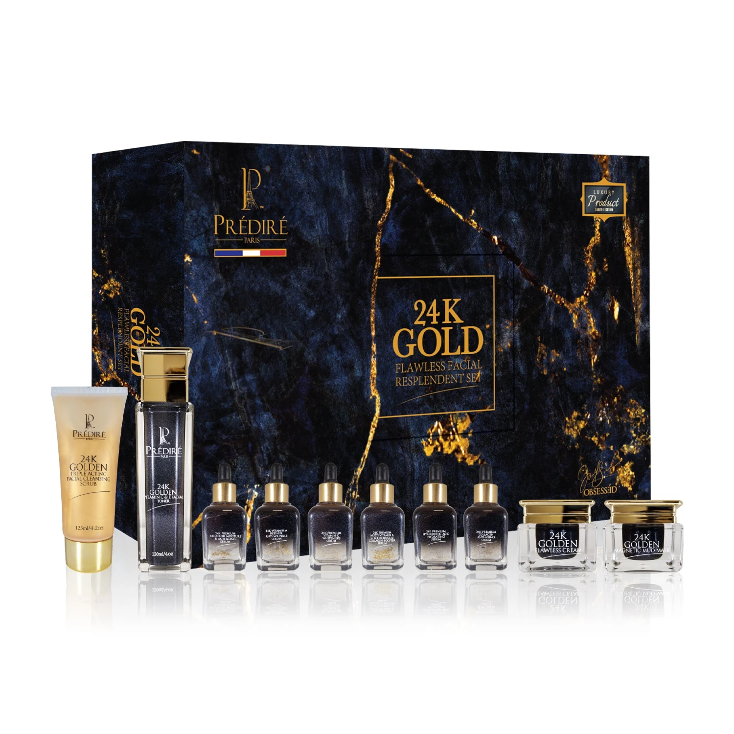 Our 24K Golden Flawless Cream formulated with the three main ingredients: fullerene, ceramide, and rose essential oil etc. Fullerene is a football-shaped molecule composed of 60 carbon atoms with a diameter of about 0.7nm. It has strong and continuous anti-oxidation ability. And the Ceramide is the main component of the stratum corneum of the skin and plays an important role in maintaining moisture retention. It can form skin protective film to protect the skin and reduce the evaporation of water between the stratum corneum cells and maintain the moisture of the skin, further protect the skin and reduce external irritation. Using our 24K Golden Flawless Cream is a good choice to achieve toned and smoother skin. Say hello to luminous glowing skin! How to Use: Cleanse skin before use. Apply a generous amount of the cream to your fingertips and gently massage on your face, neck and cleavage until absorbed. Caution: For external use only. Discontinue use if redness or irritation occurs. Avoid direct contact with the eyes. Keep out of reach of children. Store in a cool and dry place. Ingredients: Aqua, Olea Europaea (Olive) Fruit Oil, Caprylic/Capric Triglyceride, Dimethicone, Sodium Hyaluronate, Ceramide 3, Fullerenes, Cetyl Peg/ppg-10/1 Dimethicone, Rosa Rugosa Flower Oil, Phenoxyethanol, Ethylhexylglycerin, Parfum.