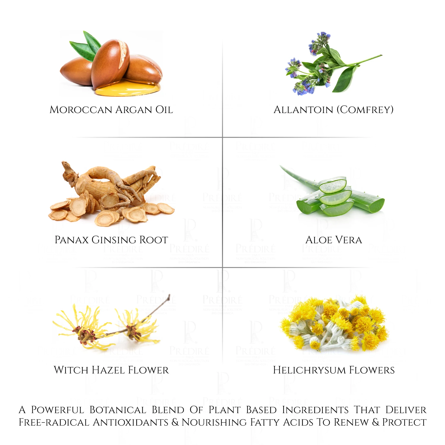 Butylene Glycol, Zeolite, Bambusa Vulgaris Leaf/Stem Extract, Alumina (Aluminum Oxide Crystals) PEG-8, Propylene Glycol, Glycerin, Glyceryl Stearate, Hydroxypropylcellulose, Methyl Gluceth-20, Phenoxyethanol, Ethylhexylglycerin, Palmitoyl Oligopeptide, Palmitoyl Tetrapeptide -7, Hydrolyzed Soy Protein, Moroccan Argan Oil (Argania Spinosa Kernel Oil), Achillea Millefolium Extract, Symphytum Officinale Leaf Extract, Hamamelis Virginiana (Witch Hazel) Leaf Extract, Humulus Lupulus (Hops) Extract, Equisetum Arvense Extract, Lavandula Angustifolia (Lavender) Extract, Calendula Officinalis Flower Extract Glycyrrhiza Glabra (Licorice) Root Extract, Citrus Limon Peel Extract, Arctium Majus Root Extract, Salvia Officinalis (Sage) Leaf Extract, Retinol