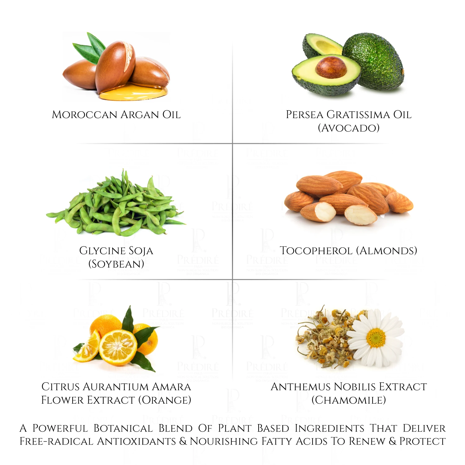 Purified Water (Aqua), Cetearyl Alcohol, Polysorbate 60, Persea Gratissima (Avocado) Oil, Glycine Soja (Soybean) Oil, Glycerin, Dimethicone, Tocopherol (Vitamin E), Hyaluronic Acid, Dimethyl MEA (DMAE), Thioctic Acid (Alpha- Lipoic Acid), Saccharomyces/Copper Ferment (Cu Complex), Carnitine, Retinol, Moroccan Argan Oil (Argania Spinosa Kernel Oil), Citrus Aurantium Amara (Orange) Flower Extract, Anthemus Nobilis (Chamomile) Extract, Â Salvia Officinalis (Sage) Extract, Citrus Arantium Bergamia (Bergamot) Extract, Phenoxyethanol, Ethylhexylglycerin, Vitis Vinifera (Grape) Seed Oil, Ubiquinone (Coenzyme Q-10)