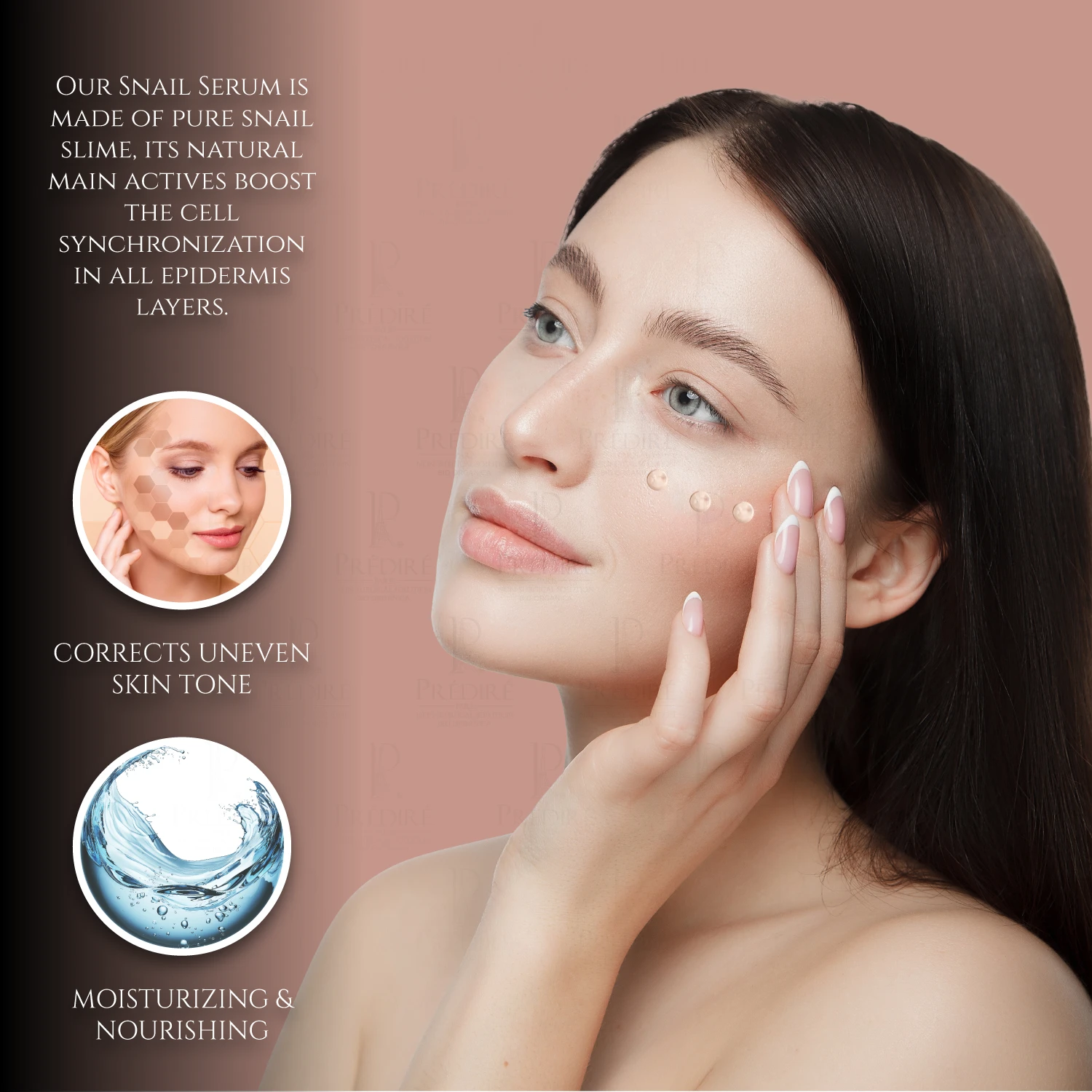 Predire Snail Skin Rejuvenating Serum is a powerful anti wrinkles action thanks to snail slime and rejuvenating. Our Snail Serum is made of pure snail slime, its natural main actives boost the cell synchronization in all epidermis layers. Dead cells are replaced by new healthy ones. The perfect combination to a younger, more beautiful skin.