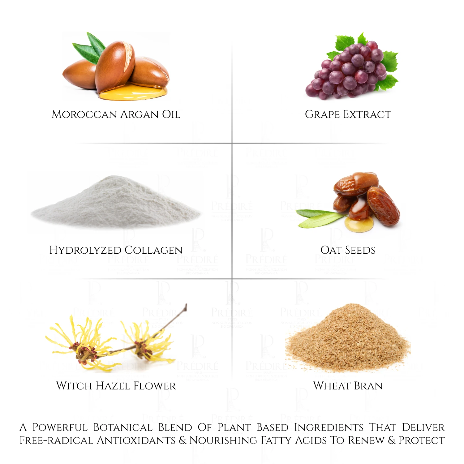 Water, Argania Spinosa Kernel Oil, Propylene Glycol, Butylene Glycol, Caprylic/capric Triglyceride, Hamamelis Virginiana (Witch Hazel) Extract, Aloe Barbadensis Leaf Extract, Cetearyl Alcohol, Trehalose, Betaine, Cetyl Peg/ppg-10/1 Dimethicone, Tocopherol, Avena Sativa (Oat) Peptide, Cetearyl Alcohol, Dextran, Oligopeptide-3, Panthenol, Hydroxyethylcellulose, Ascorbic Acid, Allantoin, Sodium Pca, Triticum Vulgare (Wheat) Germ Extract, Acetyl Cysteine, Sodium Hyaluronate, Ceramide 3, Tripeptide-1, Avena Sativa (Oat) Bran Extract, Malus Domestica Fruit Cell Culture Extract, Vitis Vinifera (Grape) Fruit Cell Extract, Collagen, Potassium Methoxysalicylate, Helichrysum Angustifolium Flower Extract, Punica Granatum Pericarp Extract, Lysine, Tropaeolum Majus Flower/leaf/stem Extract, Magnesium Sulfate, Retinol, Phenoxyethanol